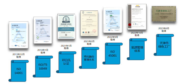 公司经过十余年的发展,申请并授权发明专利11项、实用新型专利共117项,已通过ISO/TS16949、ISO14001、ISO45001、能源管理体系认证、两化融合管理体系、邓白氏注册认证,公司坚持“诚信、敬业、利他、创新”的价值观,在为客户提供长期稳定的产品质量、纳期等基础上,获得了客户的高度认可,并多次获得客户“品质优良奖”、“特别贡献奖”、“竞争力进取奖”等表彰。成功认定为天津市天津中小企业“专精特新”产品、市级、国家级“高新技术企业”认定、天津市专精特新中小企业、天津市瞪羚企业、天津市科技领军培育企业,并于2023年荣升为天津市科技领军企业。