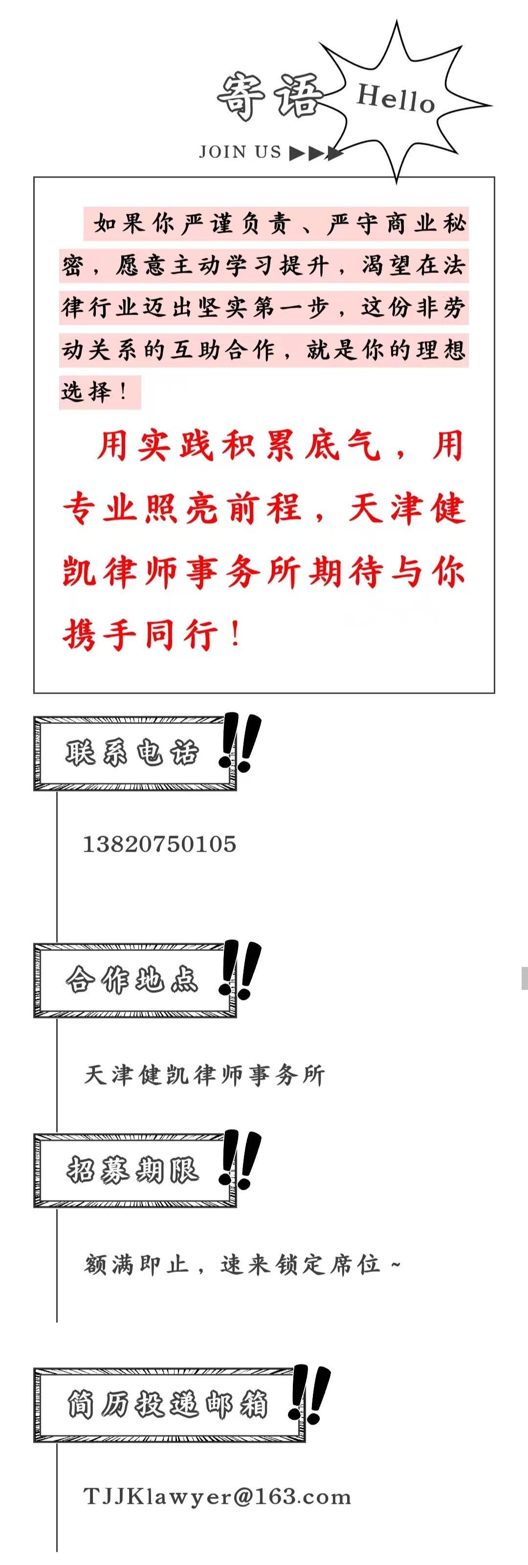 加分条件:持有法律职业资格考试(客观题/主观题)成绩单、有法律咨询/普法宣传相关实践经历者优先。